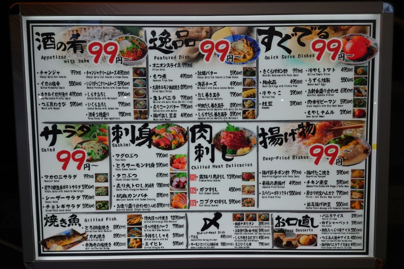 ハイボール99円(税込109円)、プレモル生299円(税込329円)の安さですが、食べ物はそれほど安くないのでたくさん食べたい場合は HOT PEPPER から予約可能な食べ飲み放題プランがおすすめです。