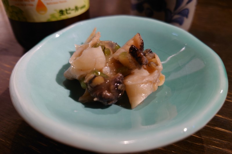 おつまみに茎わさびと和えたツブ。