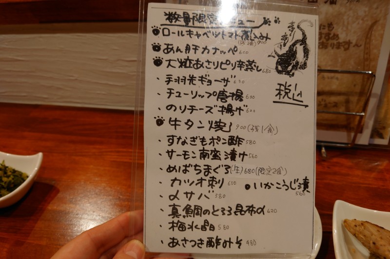 お料理がおいしそうなのと、日本酒の種類が多いこと、お手頃価格なのに落ち着いて飲めそうな雰囲気が気に入って来店。