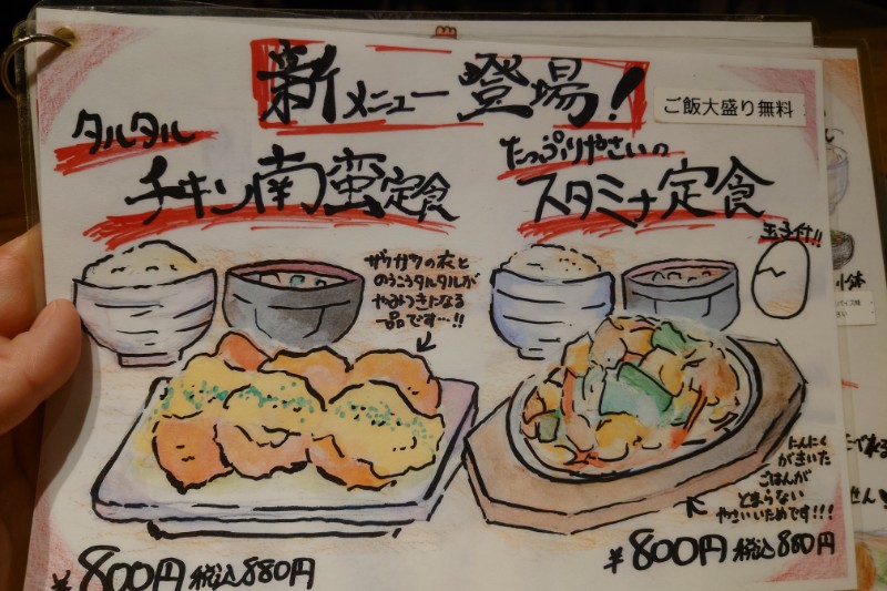チキン南蛮定食とスタミナ定食はごはん大盛りが無料。