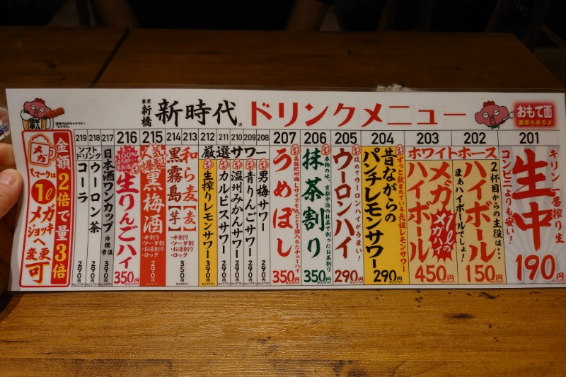 新時代は「生ビール190円(税込218円)」と看板にデカデカと書いてあり、伝串と並んで名物となっていますが、実は他のアルコール類も安いんです!