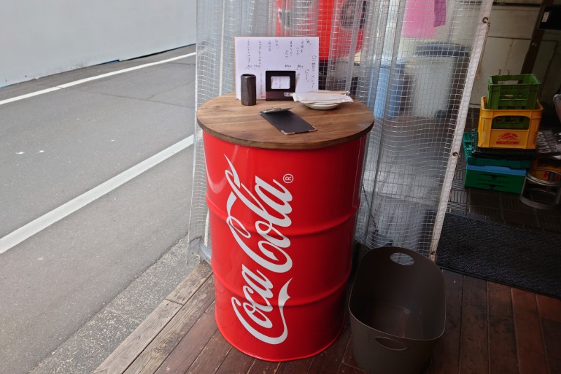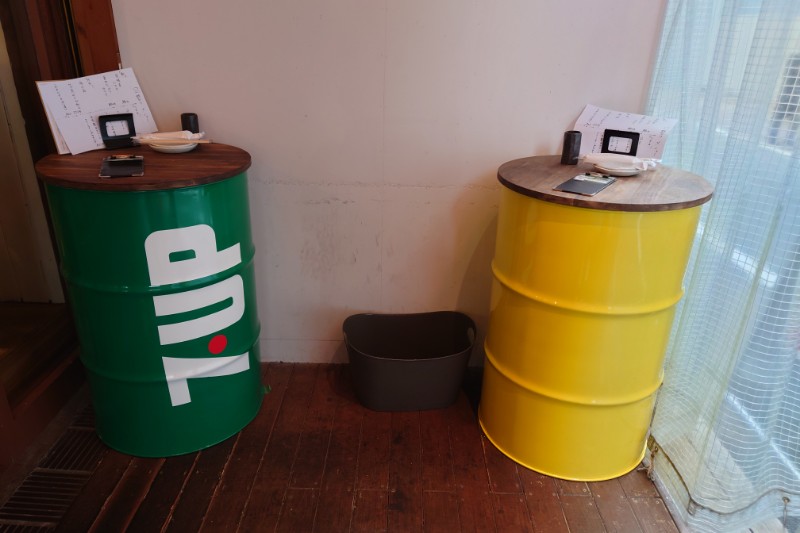 中へ進むと、入口手前にドラム缶でつくられたテーブルを発見。