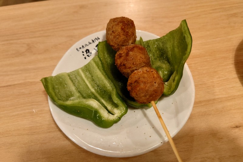 串からつくねを外して、ピーマンにつくねを挟んでいただきます!