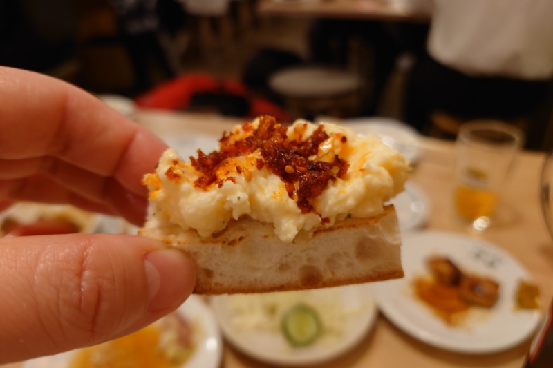 炭水化物好きのわたし。バゲットに乗せて食べるものが欲しくてポテサラとバゲットを追加注文。